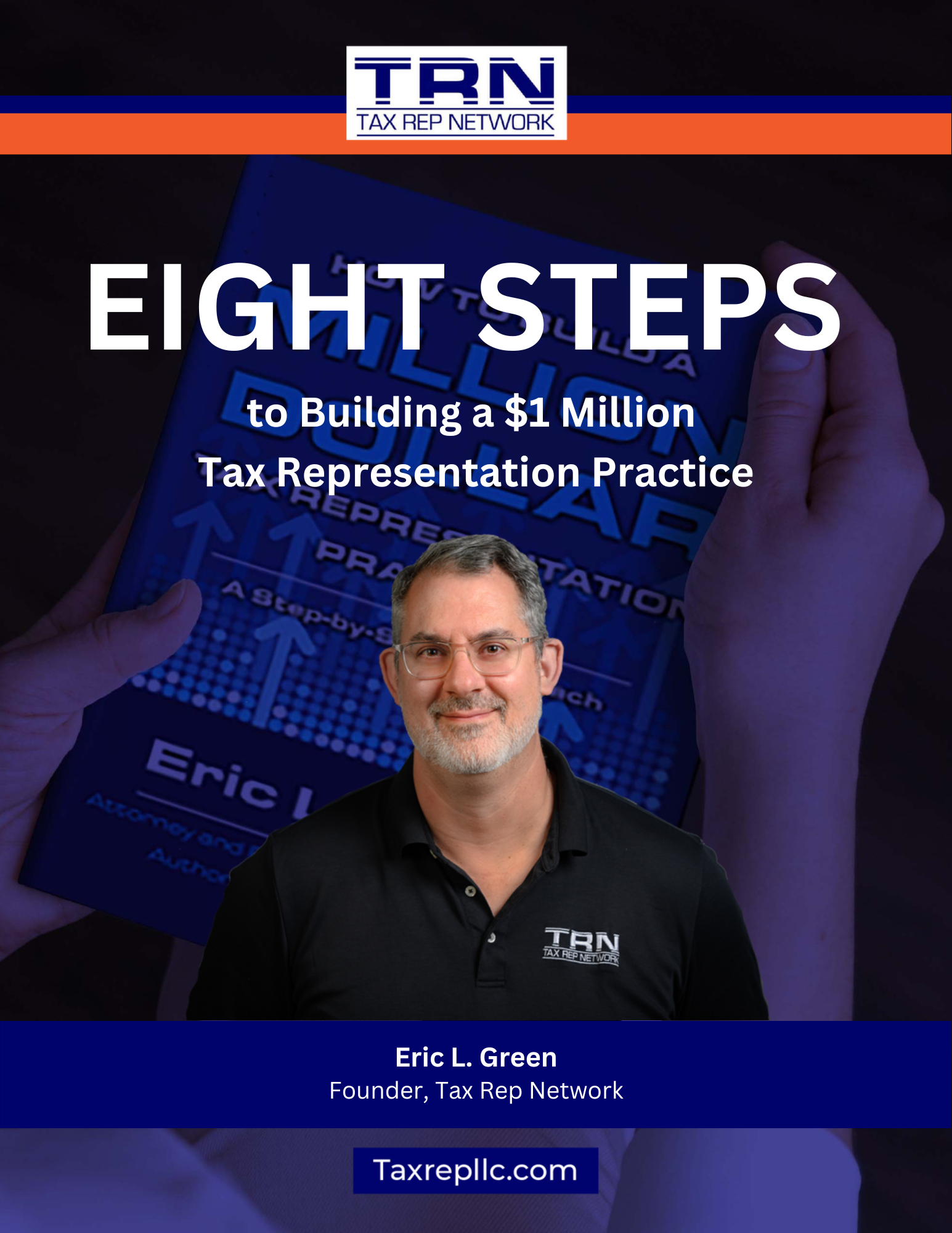 Claim your free eBook “Eight Steps to Building a $1 Million Tax Representation Practice” written by Tax Rep Network’s founder, Eric L. Green.