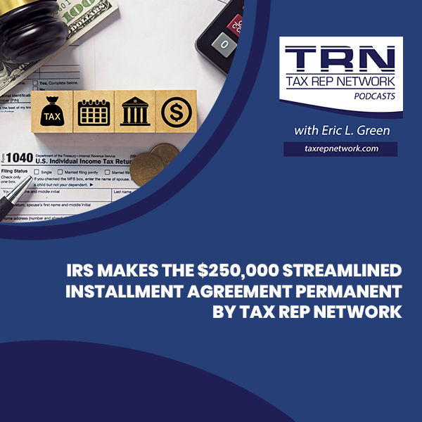 IRS Makes the $250,000 Streamlined Installment Agreement Permanent by Tax Rep Network Gallery IRS Makes the $250,000 Streamlined Installment Agreement Permanent by Tax Rep Network TRN Podcast IRS Makes the $250,000 Streamlined Installment Agreement Permanent by Tax Rep Network By eric green|2025-04-09T14:24:53-04:00January 29, 2023|TRN Podcast|0 Comments Read More