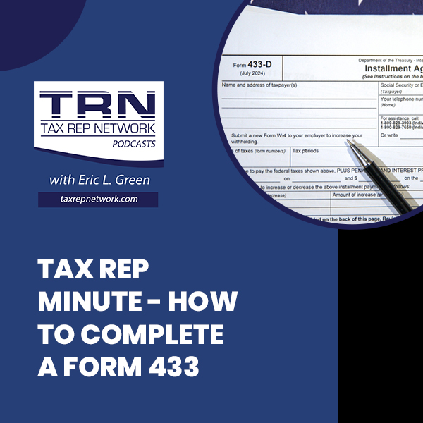 Tax Rep Minute – How To Complete A Form 433 Gallery Tax Rep Minute – How To Complete A Form 433 TRN Podcast Tax Rep Minute – How To Complete A Form 433 By eric green|2025-03-31T06:26:37-04:00November 17, 2021|TRN Podcast|0 Comments Read More